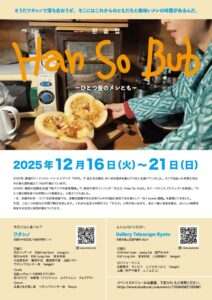 한솥밥(Han So Bub) ーひとつ釡のメシともー 12月16日(火)〜 21日(日) 会場:ワタシノ 京都府京都市中京区西ノ京勧学院町1-14 ※ワタシノには駐輪場がありません二条駅に有料駐輪場があります 「ワタシ […]